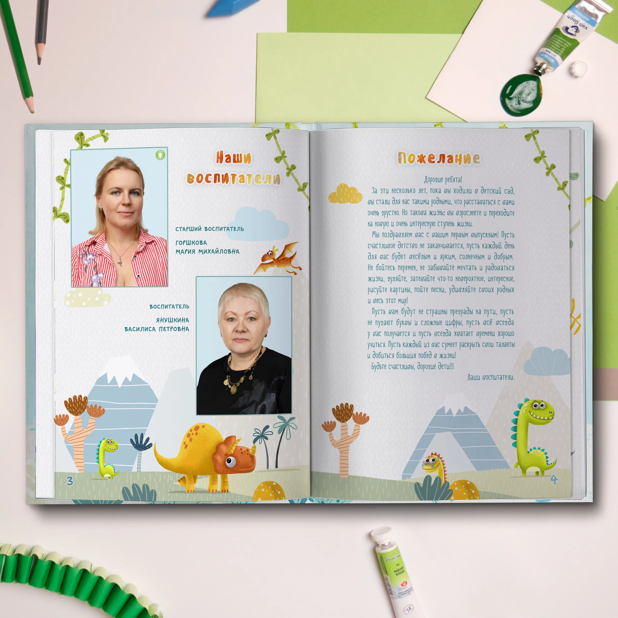 1ый разворот — виньетки педагогов и пожелание от воспитателей