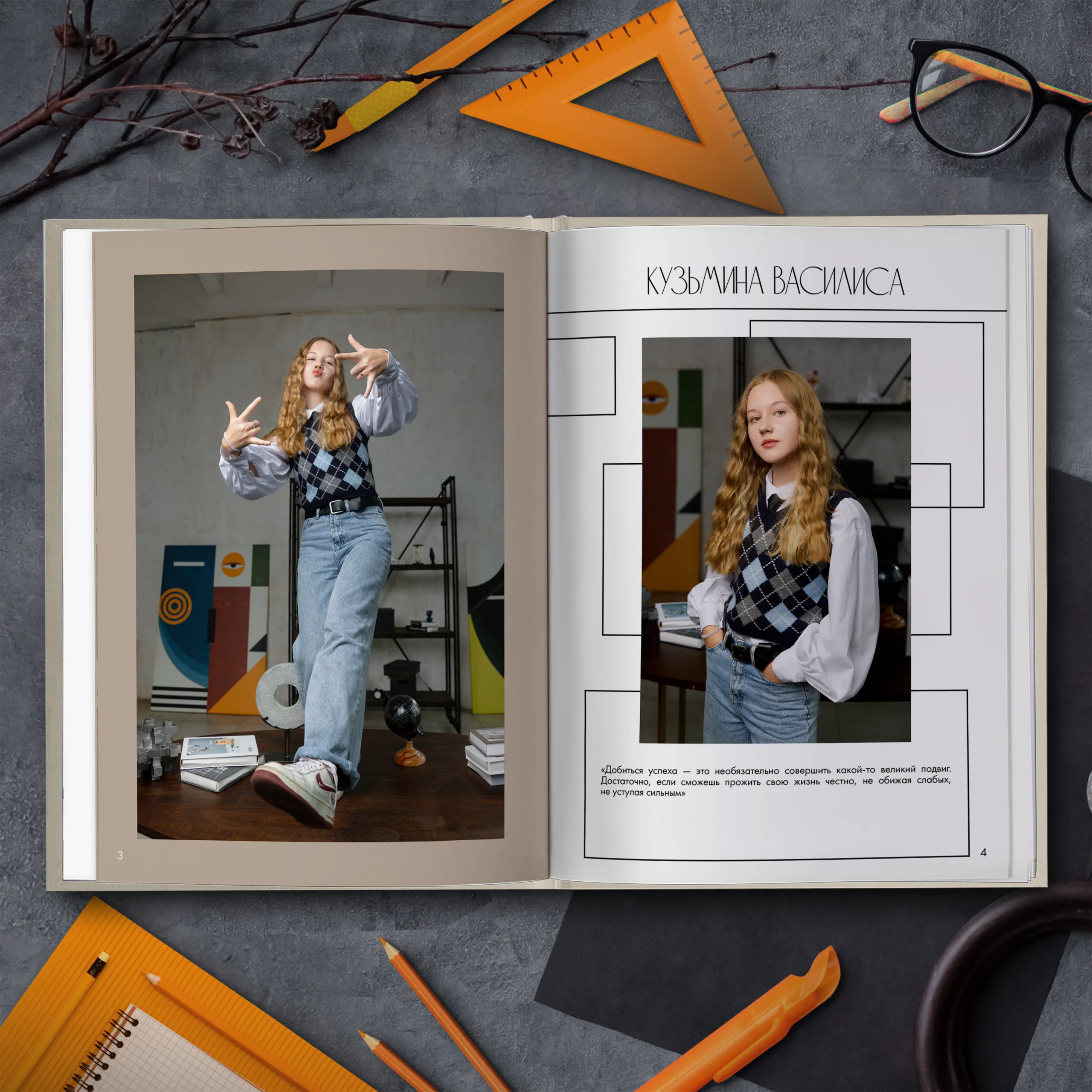 Разворот ученика, на развороте Студийное фото 3/4 и в полный рост: Классические портреты, демонстрирующие ученика в разных ракурсах.