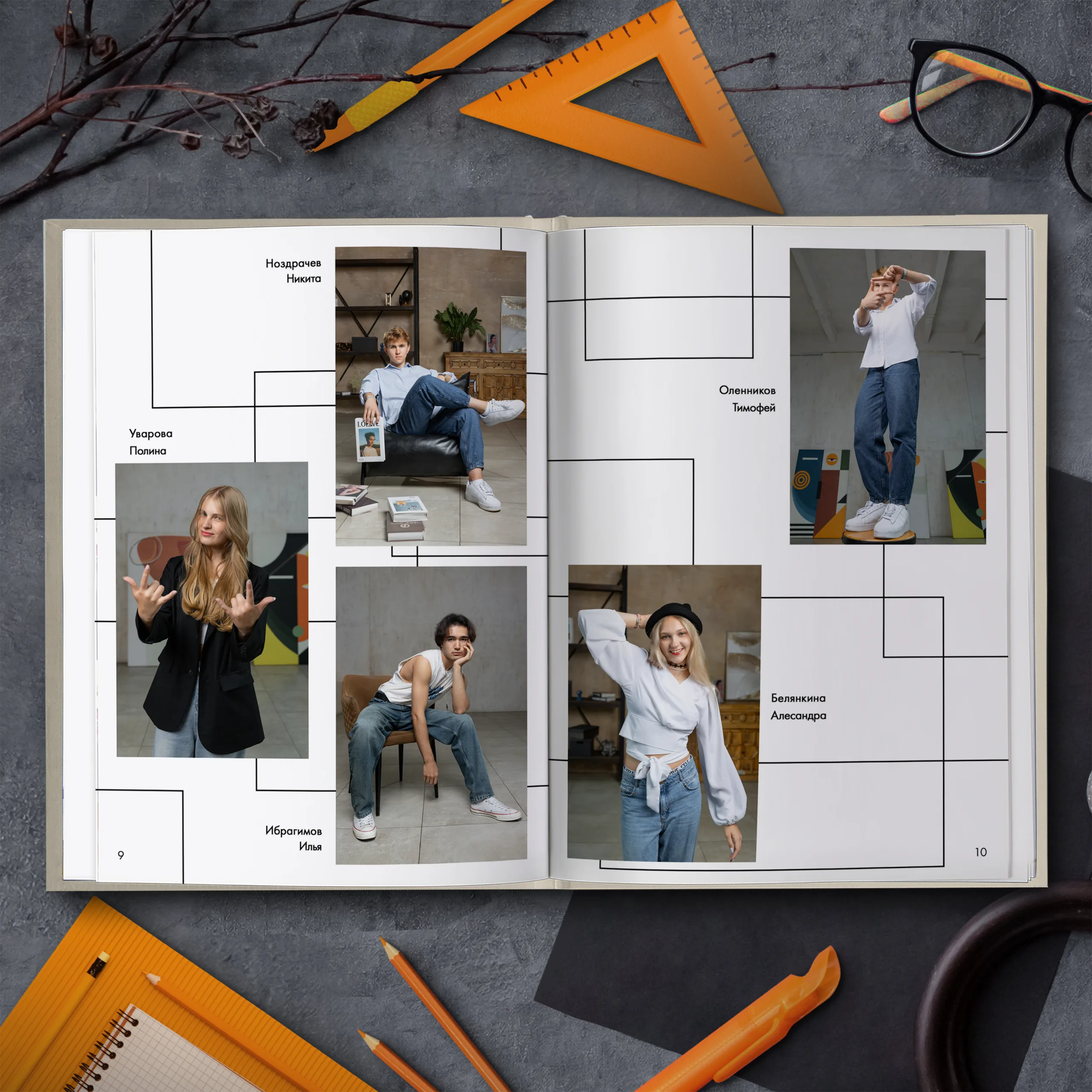Развороты с виньетками учеников по 4-6 фото на разворот