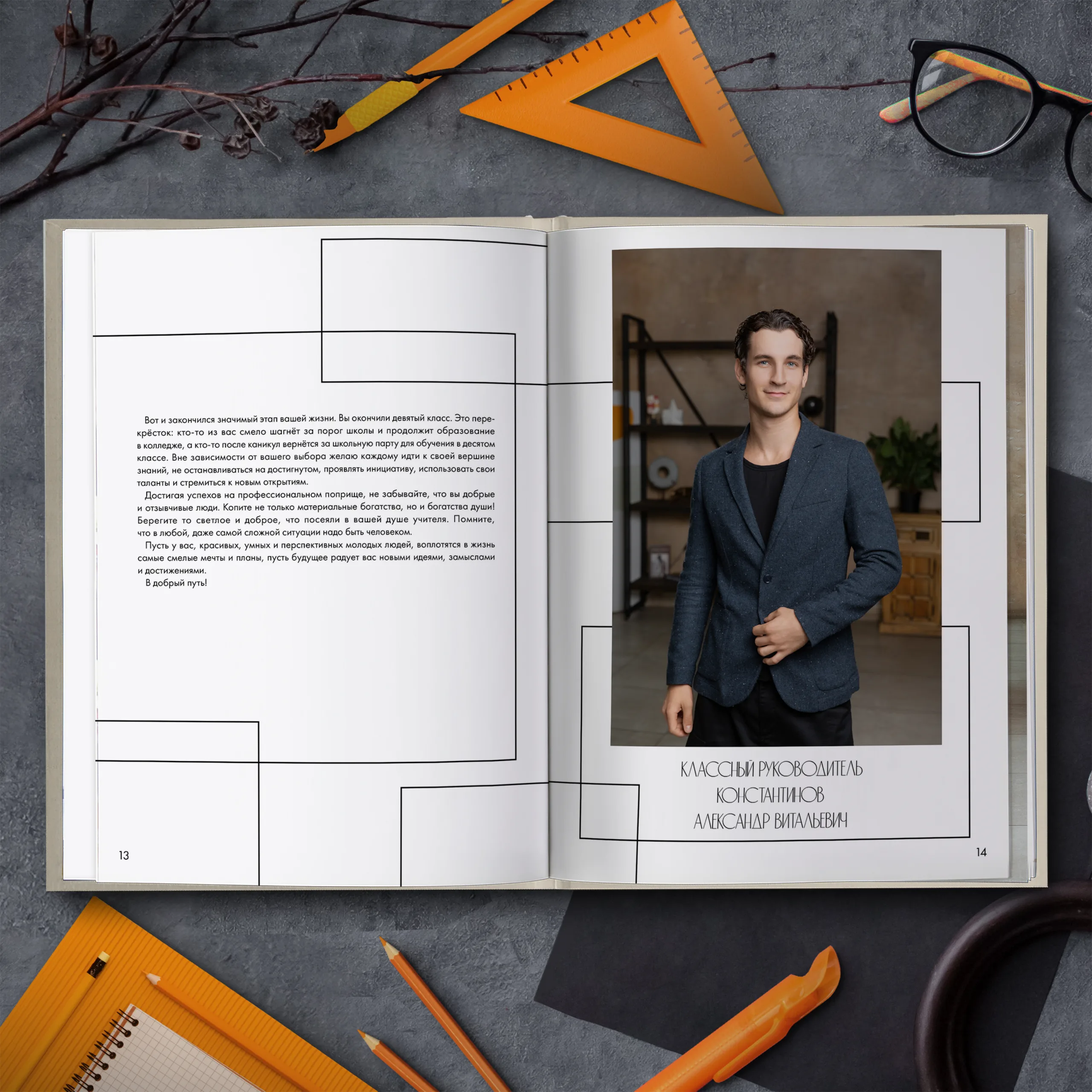 1ый разворот — виньетки педагогов и фотография классного руководителя с напутственным словом