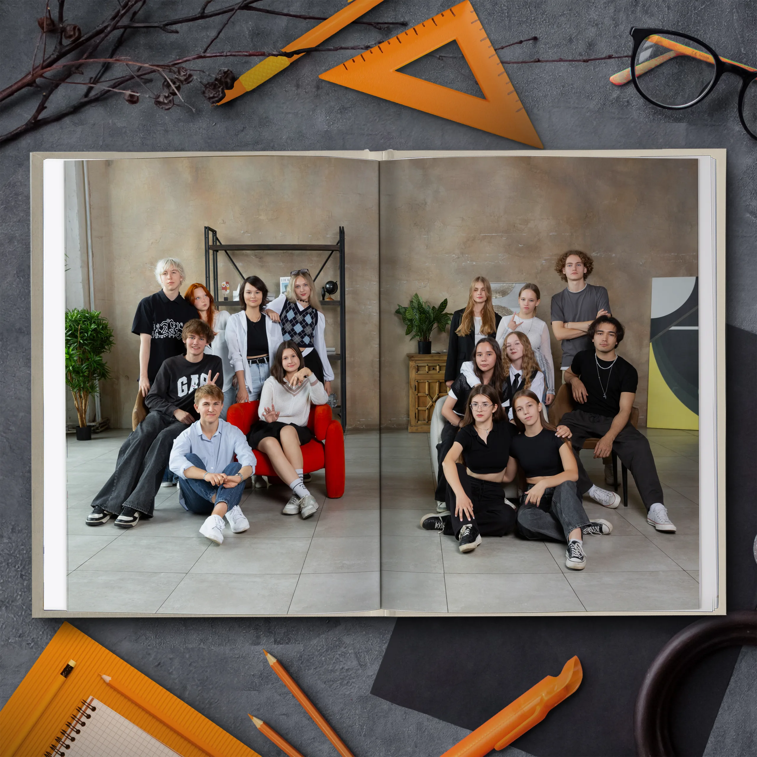 После личных страниц — разворот с общей фотографией класса